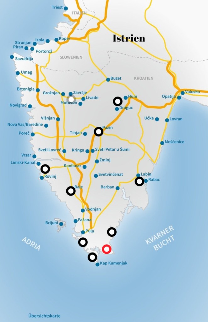 Istrien ist die größte Halbinsel an der nördlichen Adria und liegt zwischen der Kvarner-Bucht und dem Golf von Triest. Hier reihen sich Hafenstädtchen mit venezianischer Architektur aneinander und wechseln sich ab mit traumhaften Buchten und Inseln. Neben den wunderschönen pittoresken Städten, romantischen Altstädten, Stränden und Bergdörfern, gibt es Nationalparks und abwechslungsreiche Naturlandschaften. Wer Lust auf Landluft, Meeresrauschen, Kulturgeschichten oder Gourmeterlebnisse hat, findet hier einige der schönsten und lohnenswertesten Ausflugsziele: