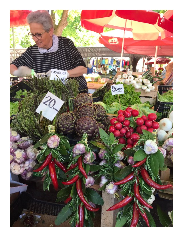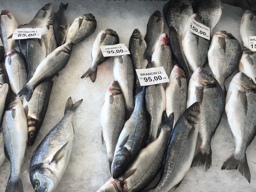 Fangfrisch oder erntefrisch: frischer Fisch, Fleisch, Gemüse, Obst, Olivenöl und Honig jeden Tag bis 12 Uhr auf dem Bauernmarkt in Pula.